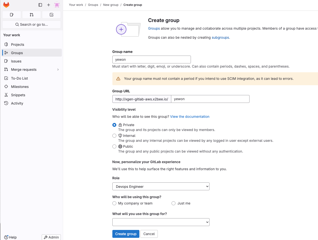 0) (Gitlab 최초 생성 시) Groups 생성하기