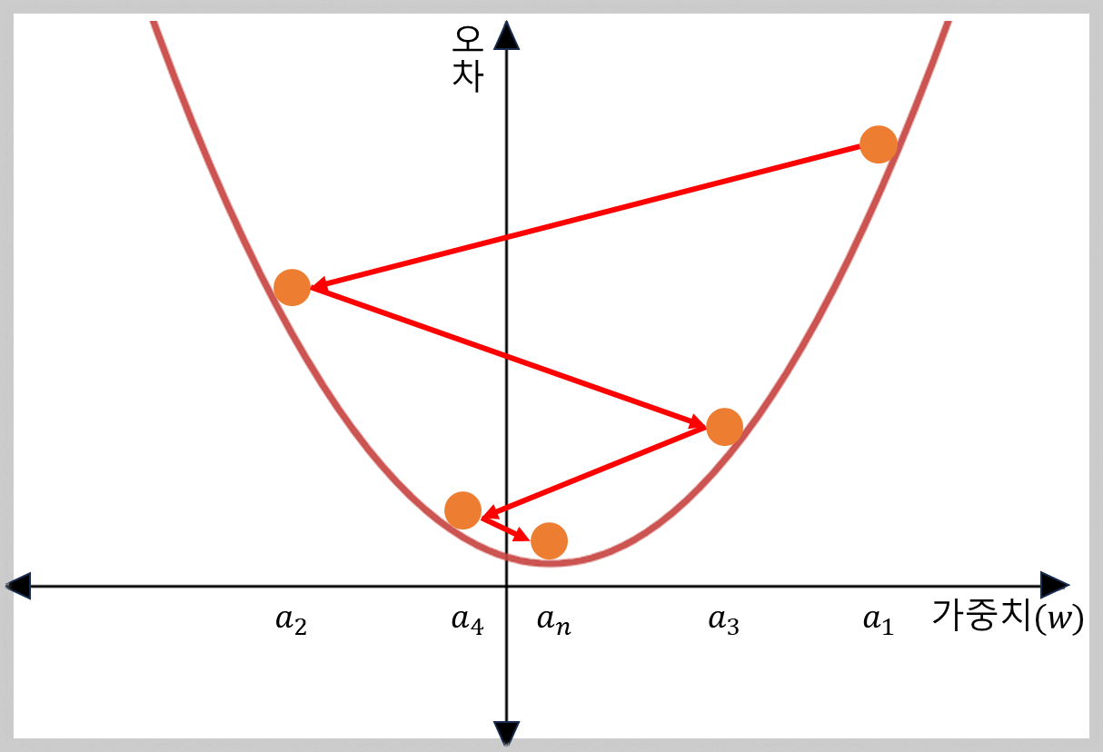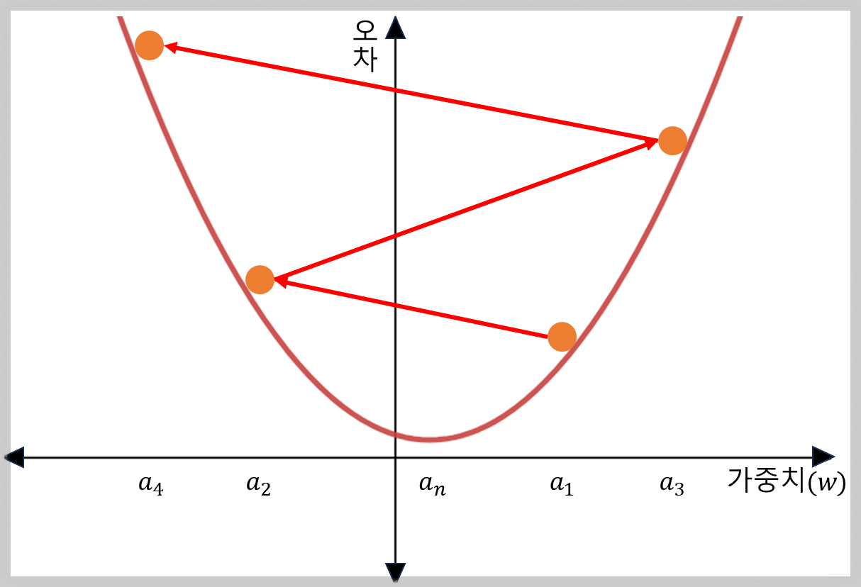 하지만 너무 크게 설정할 경우 아래 그림과 같이 오차가 한없이 커지게됩니다.
