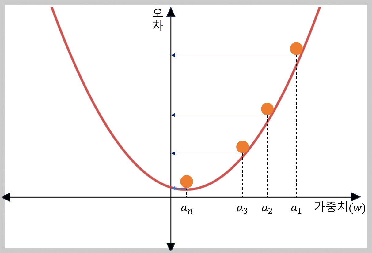 이렇게 오차의 변화에 따른 이차함수 그래프를 만들고 이를 적절한 학습률을 이용하여 가중치를 변화시켜 기울기가 최소가 되는 a_n 지점을 구하는 것이 바로 경사하강법 입니다.