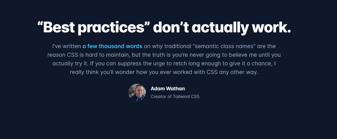 I’ve written a few thousand words on why traditional “semantic class names” are the reason CSS is hard to maintain, but the truth is you’re never going to believe me until you actually try it. If you can suppress the urge to retch long enough to give it a chance, I really think you’ll wonder how you ever worked with CSS any other way.