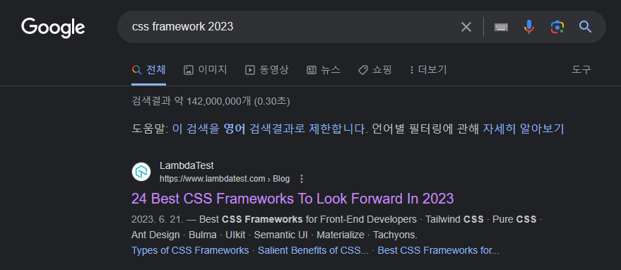 가장 먼저 노출되는 "24 Best CSS Frameworks ..." 에서 들여다보면 트렌드를 한눈에 파악할 수 있습니다.