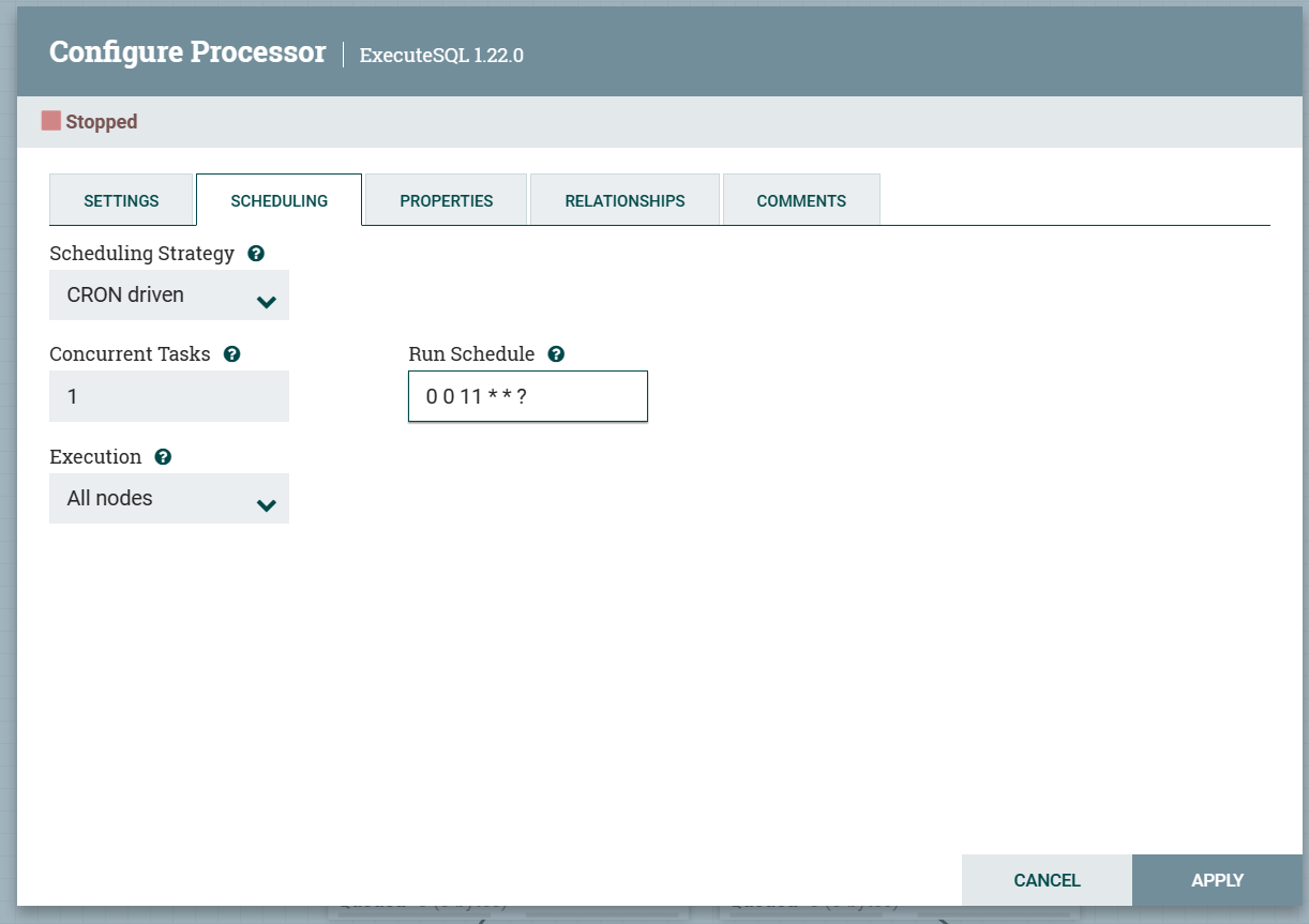NiFi에서는 프로세스 스케줄링은 cron 표현식을 사용하여 정의됩니다. 원하는 시간에 흐름 파일을 실행하려면 cron 표현식을 사용하여 Schedule을 설정해야 합니다.