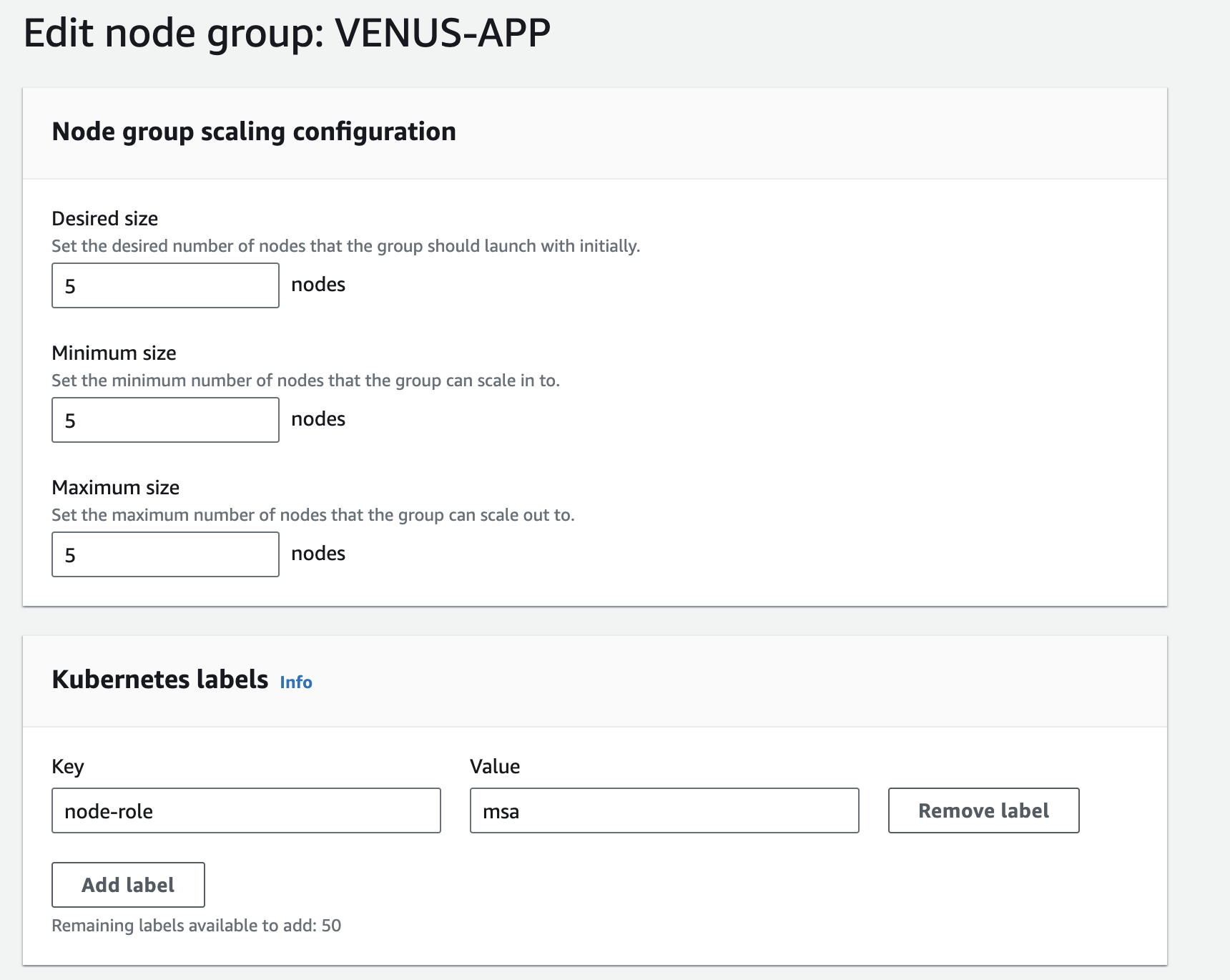 우리가 생성한 VENUS-APP이라는 node group의 worker node 5개에 전부 node-role=msa라는 label을 붙일 수 있다.