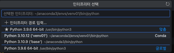 실행하기 위해서는 VS code에서 python interpreter를 선택해줘야하는데