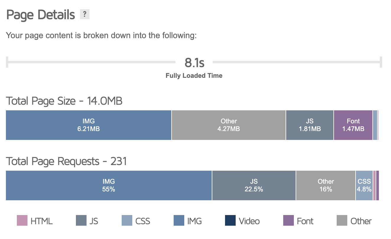 하지만 다음은 GTmetrix라는 사이트에서 로딩시간이 8초 걸리는 어떤 사이트를 분석한 결과다.