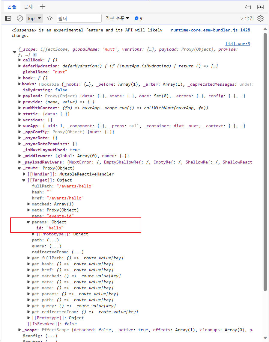 브라우저 콘솔을 확인하면 아래와 같이 보일 것이다. Nuxt App 의 전체 컨텍스트 정보를 담고 있기 때문에 useRoute 컴포저블을 사용해 가져온 라우트 관련 정보도 확인할 수 있다.