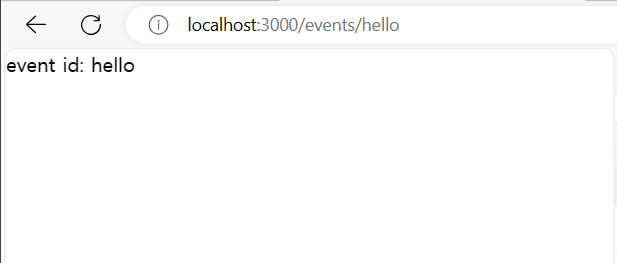 http://localhost:3000/events/1234 를 호출해 보자. 아래와 같이 보일 것이다. 동적 라우팅 페이지를 추가하면 HMR 이 작동되지 않는 경우가 있다. 이럴 경우 서버를 다시 기동해야 한다.