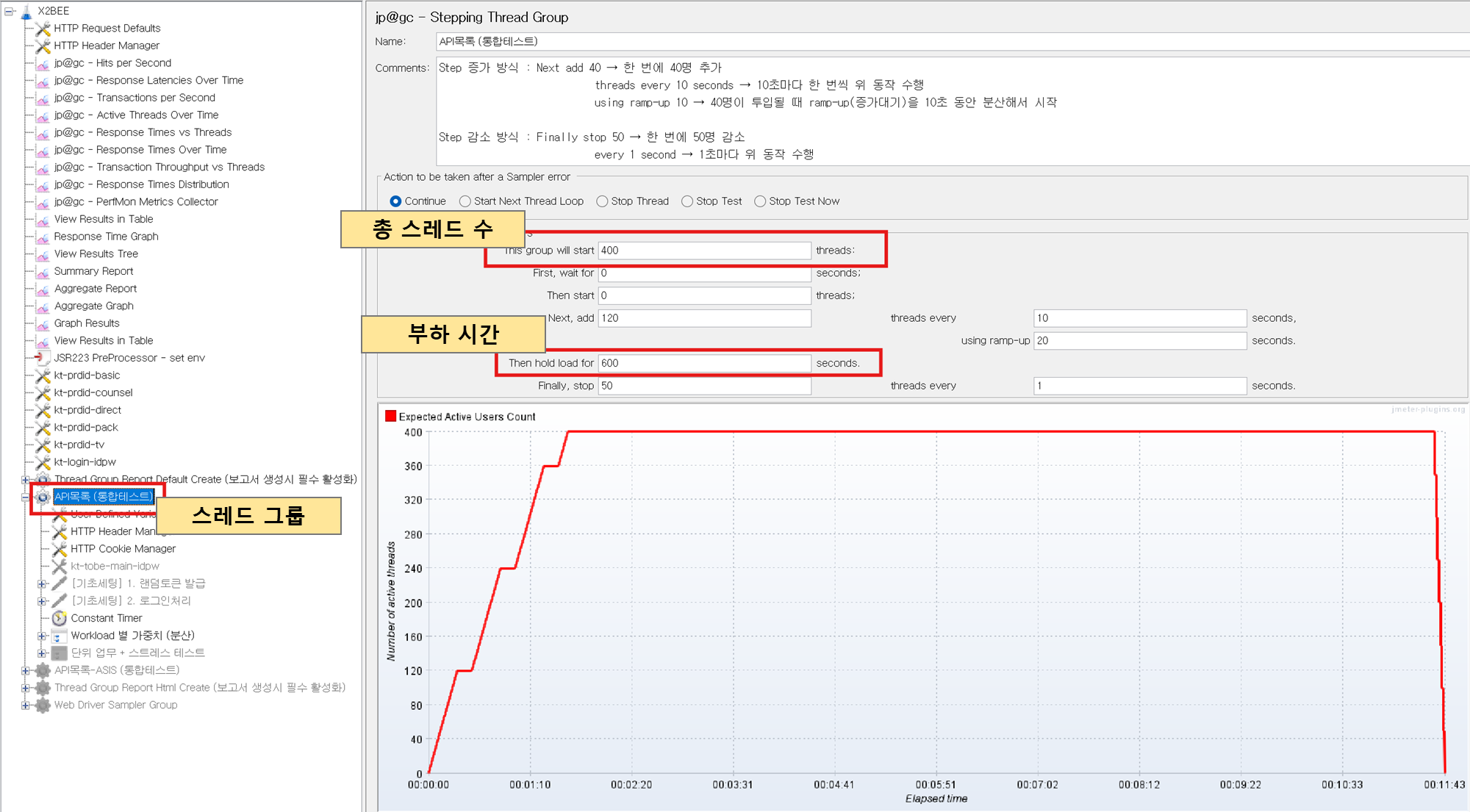 '총 스레드 수', '부하 시간' 등의 설정을 확인합니다.
