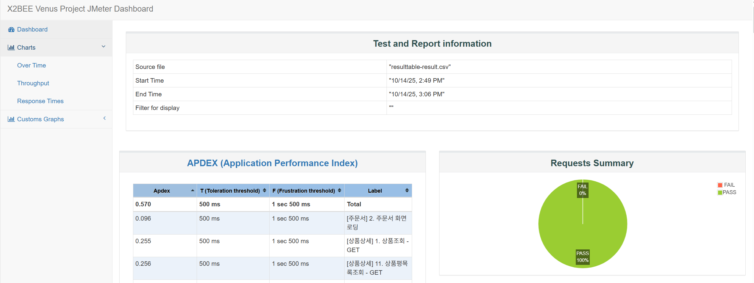 수행 시간 및 Request 성공 여부(원 그래프)로 나타납니다.