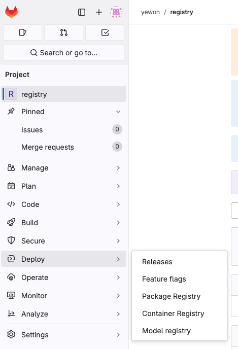 - gitlab UI에서 접속하여 Docker Registry 환경을 세팅해봅시다.